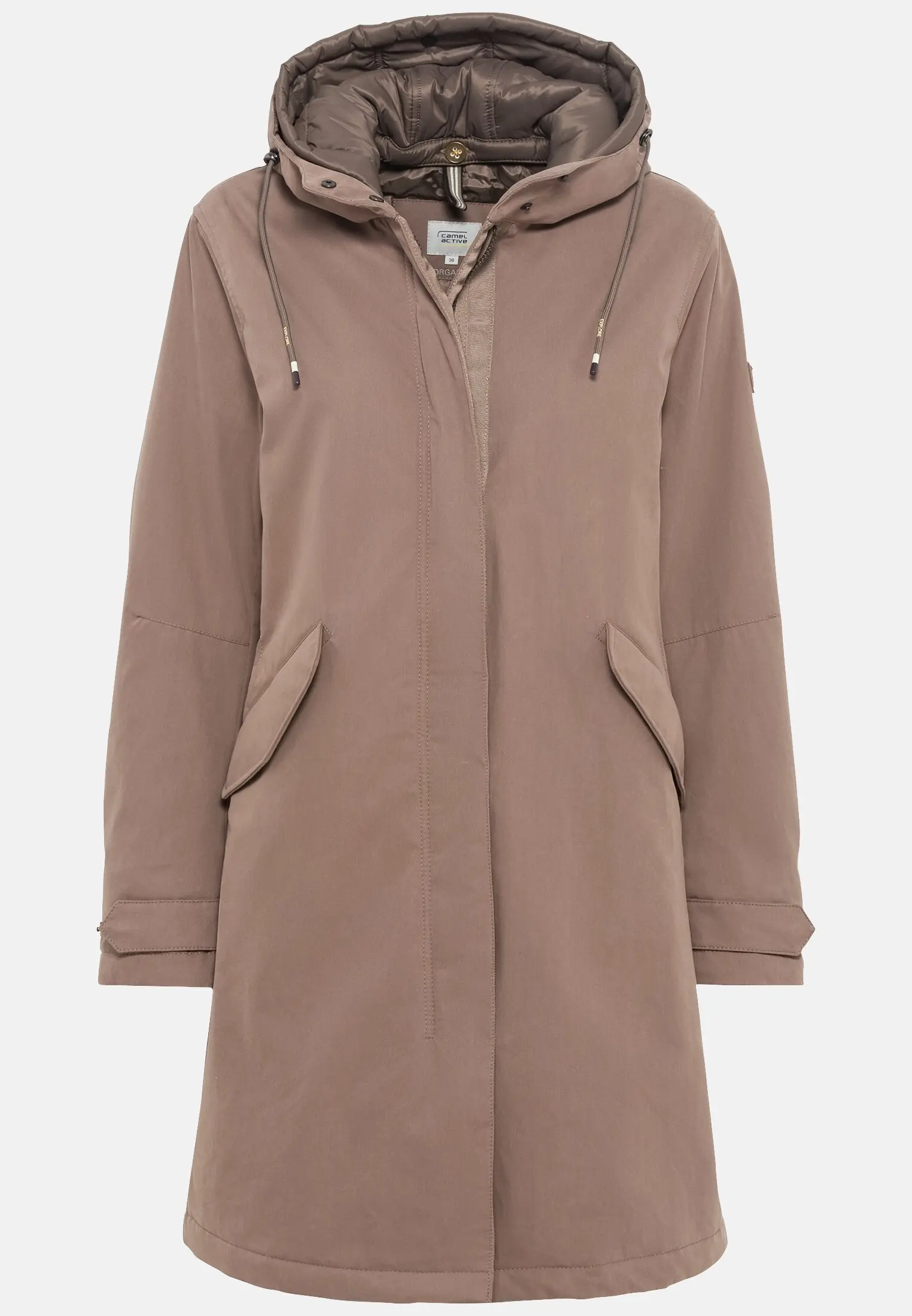 Made from a recycled cotton blend, this down-free functional coat is water-repellent and windproof. The functional features are complemented by a cool design. The coat has a relaxed fit, a brushed finish, a drawstring waist and a hood with removable quilted lining. There is a storm flap with press studs at the top of the 2-way zip. The front pockets are closed with snap flaps. The camel active brand logo is placed on the left sleeve.