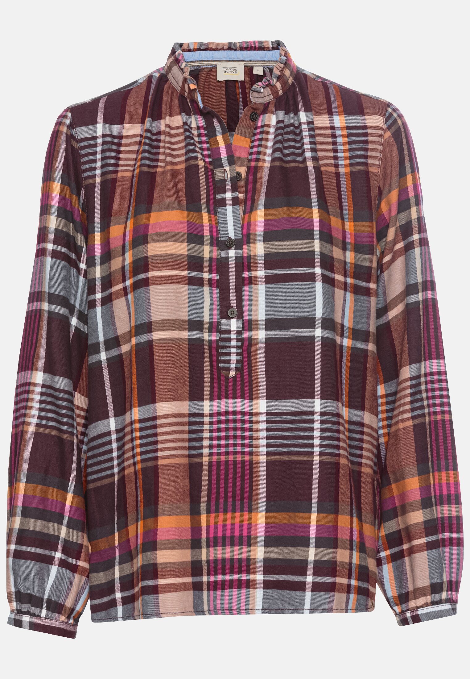 Thanks to its durable cotton blend, this blouse feels pleasantly soft against the skin and is perfect for relaxed leisure looks. Its rustic appeal is highlighted by a bold check pattern, complemented by delicate details like the stand-up collar with a ruffle trim. A short button placket and adjustable cuffs complete the design, underscoring the blouse's unique style.