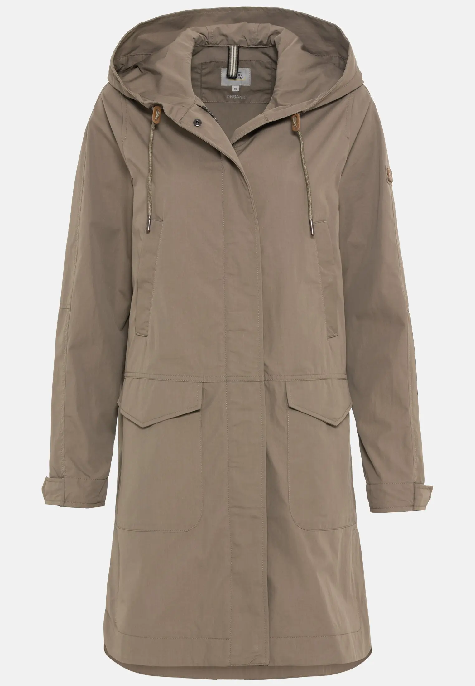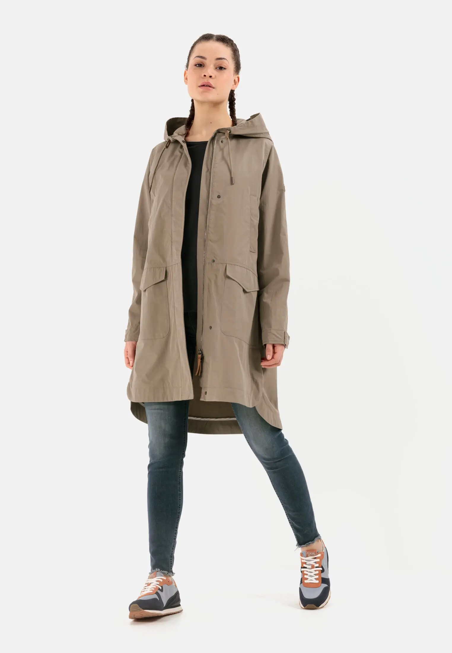 This cozy practical coat has a durable outer layer made from a comfortable cotton blend. Its patch flap pockets create a sporty look, while the feminine shawl collar on the fixed hood add a tasteful contrasting element. You can also use a convenient drawstring to adjust the hood volume precisely to your taste. Slits at the sides and a longer cut at the back for extra comfort complete the styling of this fashionable coat.