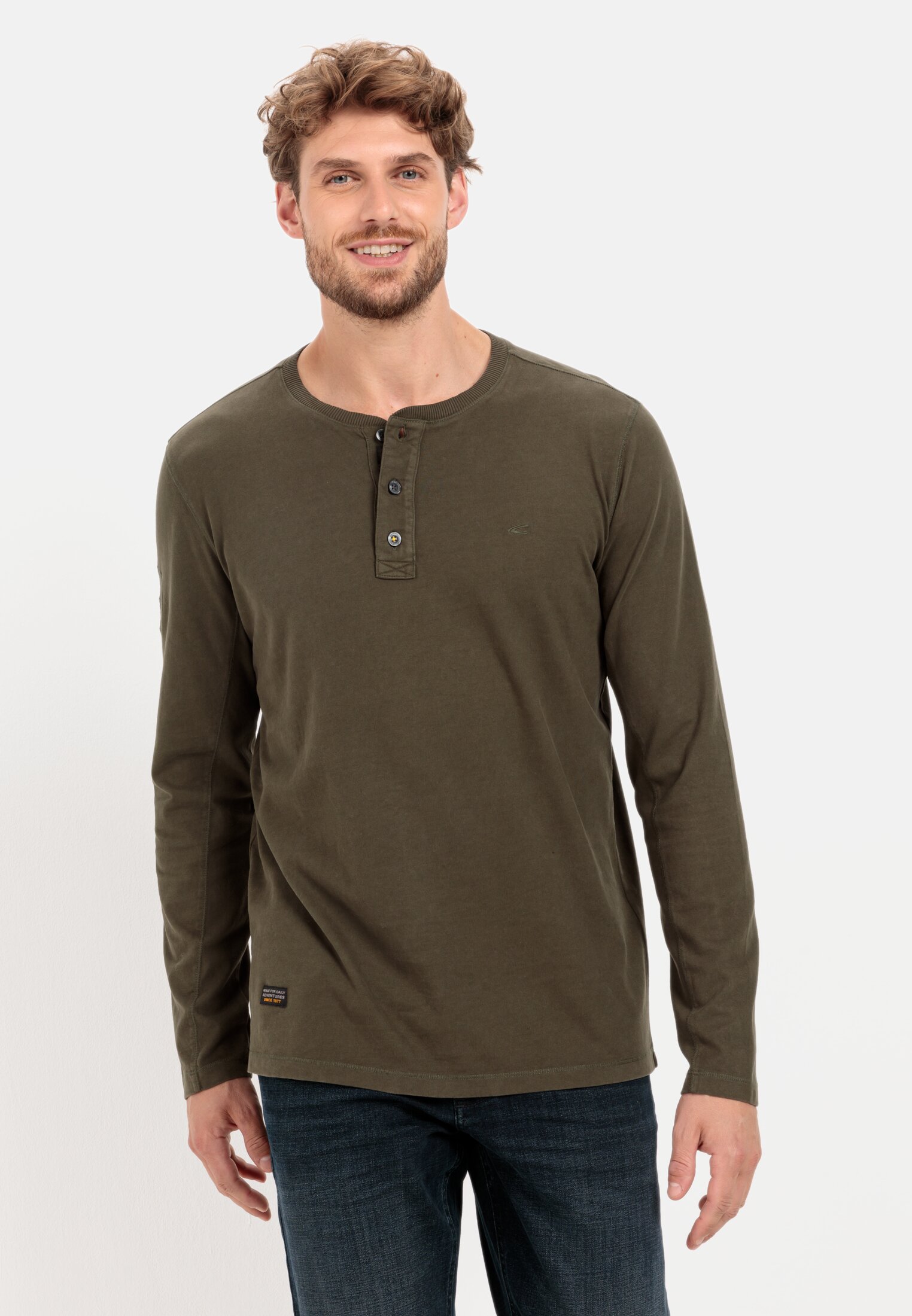 Long-sleeved henley shirt made from reliably comfortable cotton with bold charm. The relaxed cut cotton shirt is breathable, easy-care and absorbent. For an additional sporty look, the henley is designed with a split seam on the sleeve. It also features a camel active brand patch on the right sleeve and camel active logo embroidery on the chest.