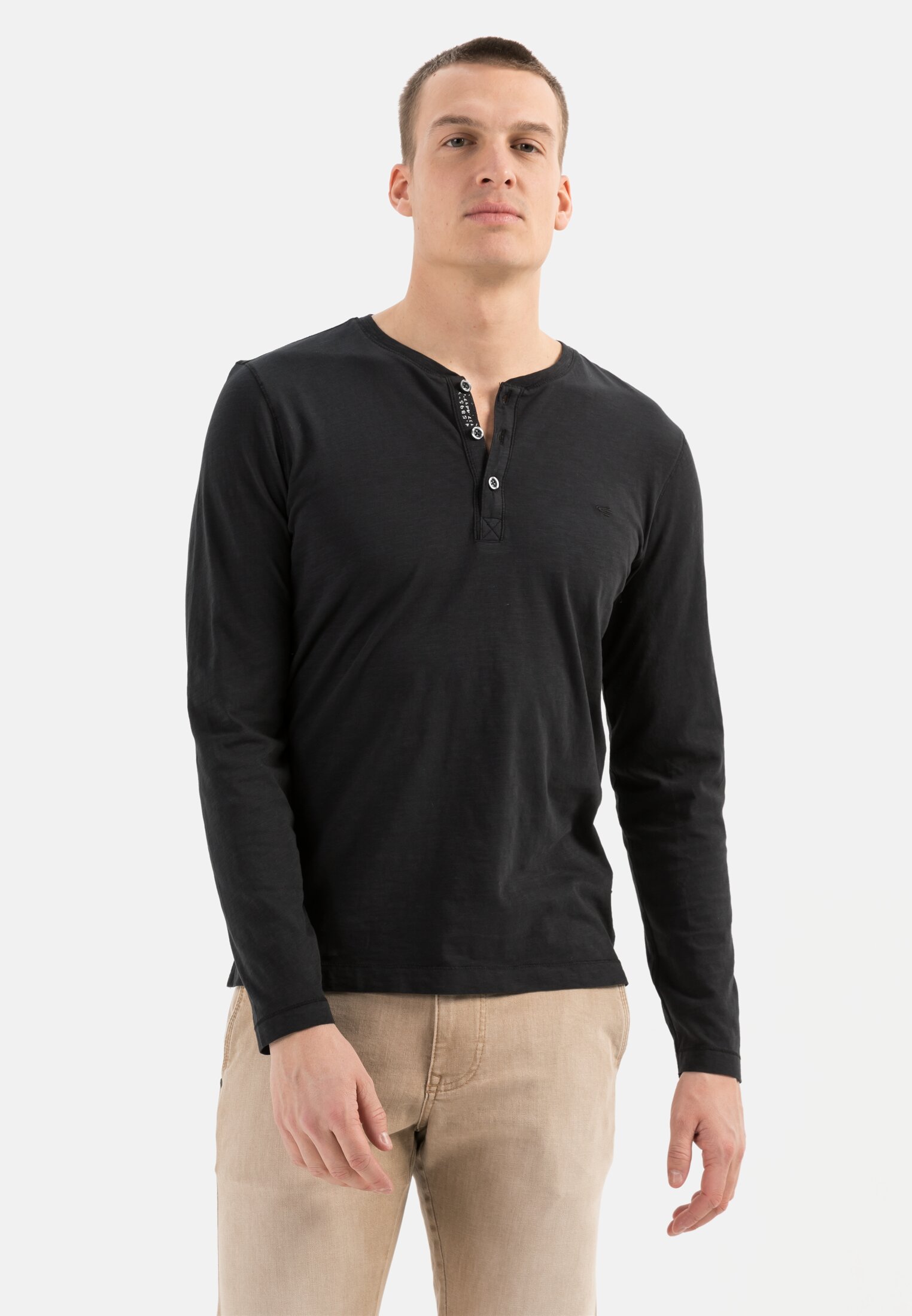 This long-sleeved shirt with a Henley collar is as comfortable as it is stylish. The breathable material is made from a pure cotton in mottled yarn quality with an attractive, slightly textured feel. Dyed after production using a special garment dye process to save resources, this regular fit shirt has small side slits to ensure an optimum fit.
