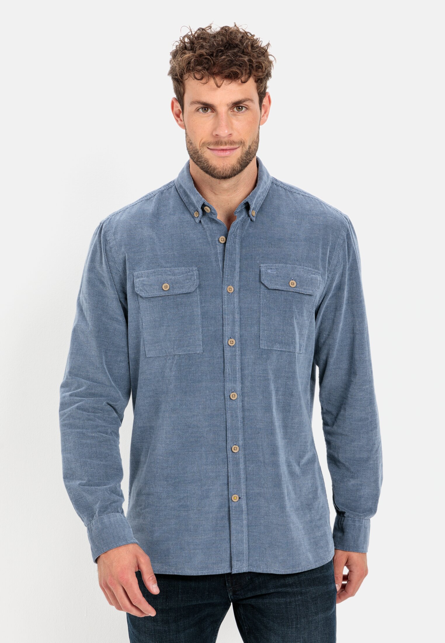 Solid long sleeve shirt in pure cotton and broken corduroy quality. Breathable, absorbent and comfortable to wear. The cotton shirt is also easy to care for. The long-sleeved corduroy shirt has a regular fit, a button-down collar and two breast flap pockets. A camel active logo is embroidered on the left flap.