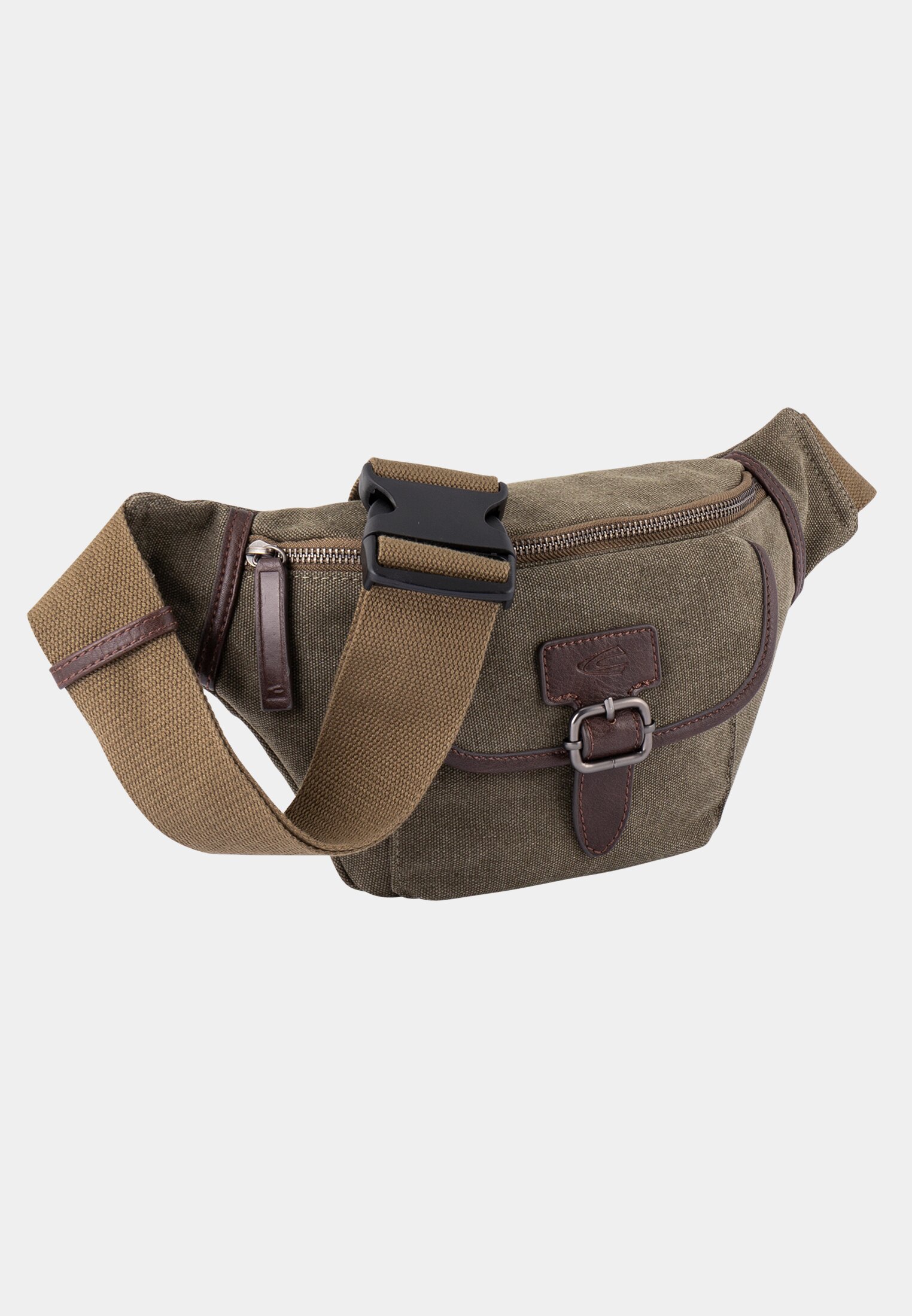 The belt bag, crafted from durable canvas material, features a practical main compartment secured with a metal zipper, complemented by an additional zippered pocket at the back. For quick access, the bag offers a front pocket with a flap closure, accented by PU binding and a metal buckle in matte gun-metal design. The adjustable strap, made from high-quality cotton webbing, is fastened with a distinctive plastic click closure. Inside, there is an open slip pocket and a zippered pocket for added storage options.