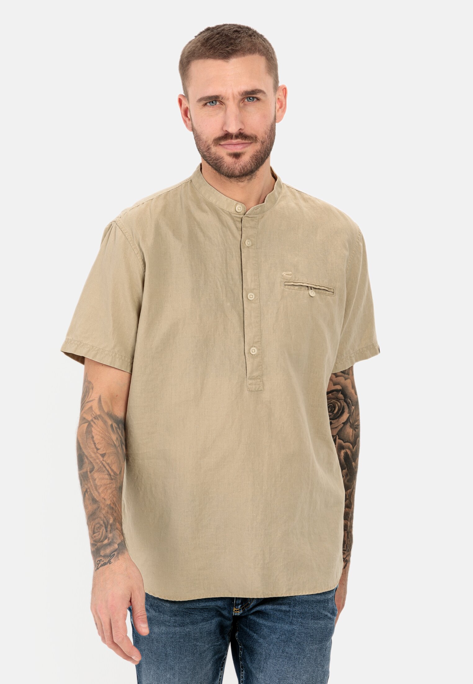 Entdecke das Regular Fit Kurzarmhemd aus Leinen und Baumwolle. Perfekt für warme Tage dank seiner atmungsaktiven Eigenschaften. Der Mao-Kragen und die halblange Knopfleiste setzen moderne Akzente. Die paspelierte Brusttasche mit Knopfleiste ist mit einer camel active Logostickerei veredelt. Modisch, strapazierfähig und pflegeleicht – ein Hemd für City- und Outdoor-Looks.