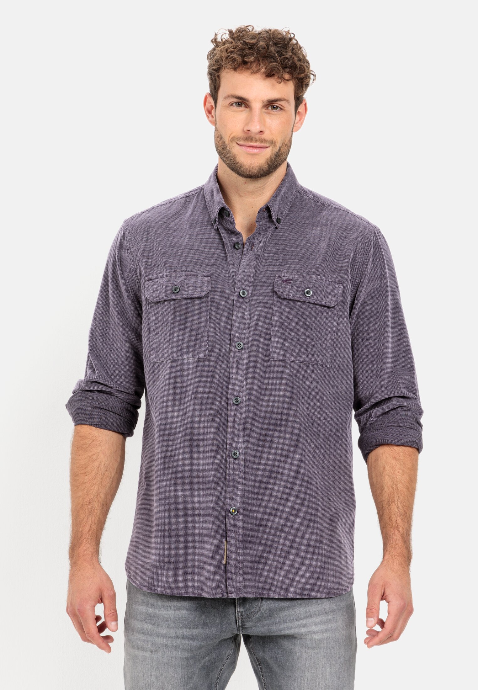 Kerniges Langarmhemd aus reiner Baumwolle und einer gebrochenen Cordqualität. Atmungsaktivität, saugfähige und solide Trageeigenschaften erwarten dich hier. Dazu ist das Baumwollshirt pflegeleicht. Das langärmelige Cordhemd ist im Regular Fit geschnitten sowie mit Button-down-Kragen und zwei Brustpattentaschen designt. Auf die linke Patte ist ein camel active Logo gestickt.