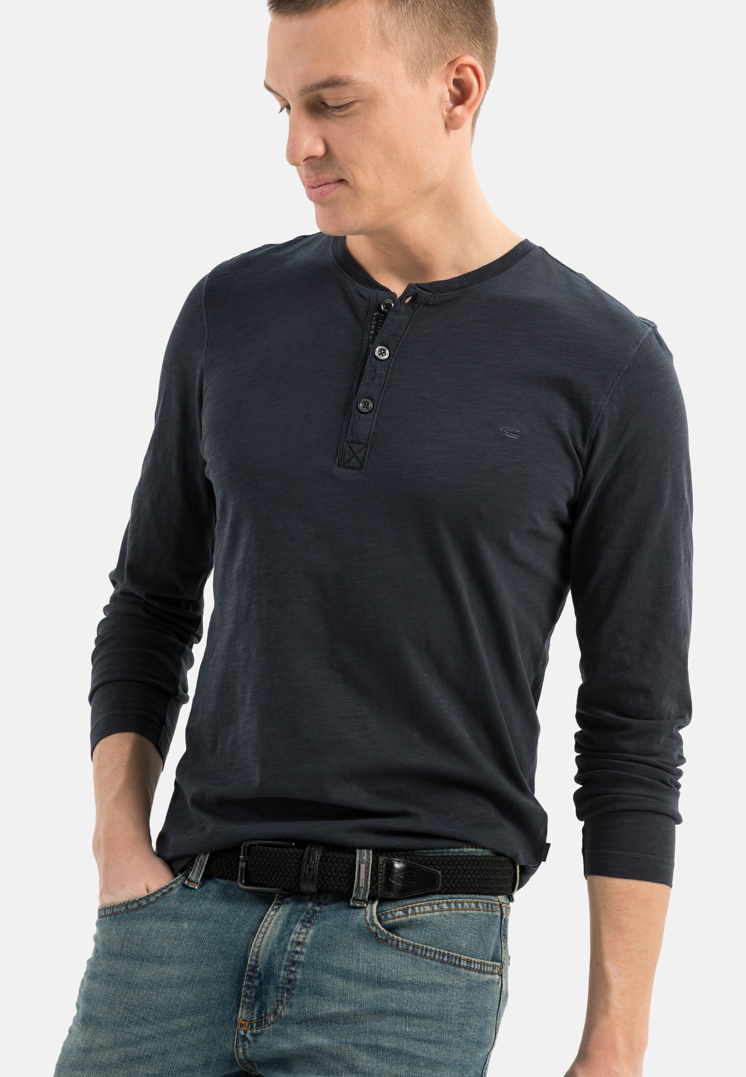 Dieses Langarmshirt mit Henley-Kragen zeigt sich so bequem wie stilsicher. Das Material aus reiner Baumwolle in Flammgarn-Qualität ist atmungsaktiv und hat dazu eine attraktive, leicht texturierte Haptik. Ressourcenschonend nach Fertigung gefärbt („garment dye“). Die Regular-Fit-Passform und die kleinen Seitenschlitze sorgen für einen guten Sitz.