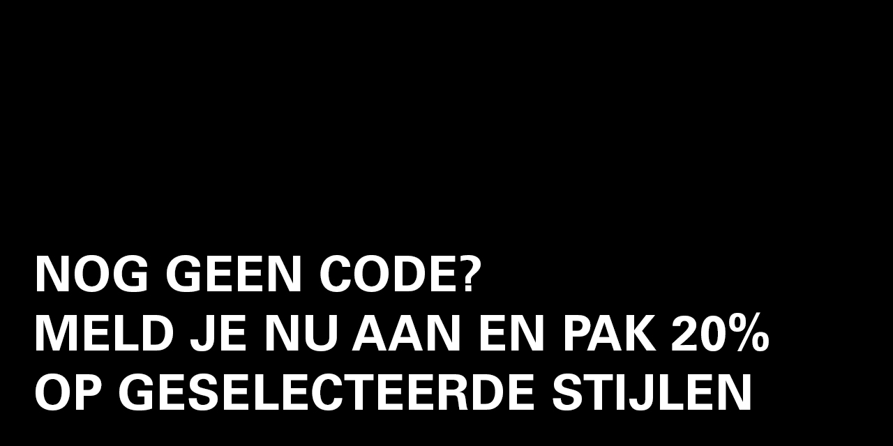 Meld je aan en je ontvangt ’m per mail. Zo pak je 20% korting op geselecteerde styles.