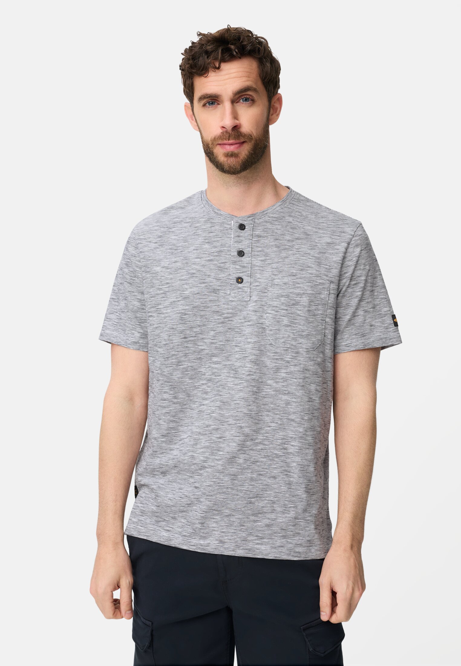 Das T-Shirt überzeugt mit einem klassischen Henley-Design und durchdachter Verarbeitung. Gefertigt aus reiner Baumwolle bietet es angenehmen Tragekomfort und hohe Atmungsaktivität. Praktische Details wie eine Knopfleiste mit drei Druckknöpfen und eine Brusttasche fügen Funktionalität hinzu. Seitliche Schlitze und der gerade Saum sorgen für optimale Bewegungsfreiheit. Das Regular Fit macht das Shirt für verschiedene Anlässe geeignet und ergänzt jede Garderobe mit einem lässigen, unkomplizierten Look. Pflegeleicht und strapazierfähig zeigt sich das Produkt als idealer Begleiter im Alltag.